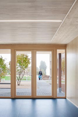 Der warme Holzfarbton, der Fassaden, Loggien und Laubengängen ihren eigenen Charakter verleiht, spiegelt sich auch im Innenraum wieder: Massivholzwände und –decken werden in einfacher Industriesichtqualität gezeigt. Die Ausnutzung des Satteldaches als Maisonette-Typologie reduziert Erschließungsflächen und ermöglicht ein Leben auf zwei Ebenen. Freie Spannweiten der HBV-Decken und der nichttragende Innenausbau schaffen auch in den nächsten Generationen flexible Umbauoptionen.