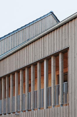 Das Detail entwickelt sich aus der materialgerechten Fügung der Elemente. Funktional Notwendiges wird nicht versteckt, sondern gliedert die Struktur. Das kleinste Gliederungselement – die Holzlamelle – definiert die Setzungen der Leuchten, Brüstungen, Öffnungen. Ein in sich stimmiges Gesamtgefüge ist nicht das Ziel dieses Konzeptes, sondern die logische Konsequenz. Zurückhaltung und Einfachheit entspricht dem Wesen des Materials Holz.